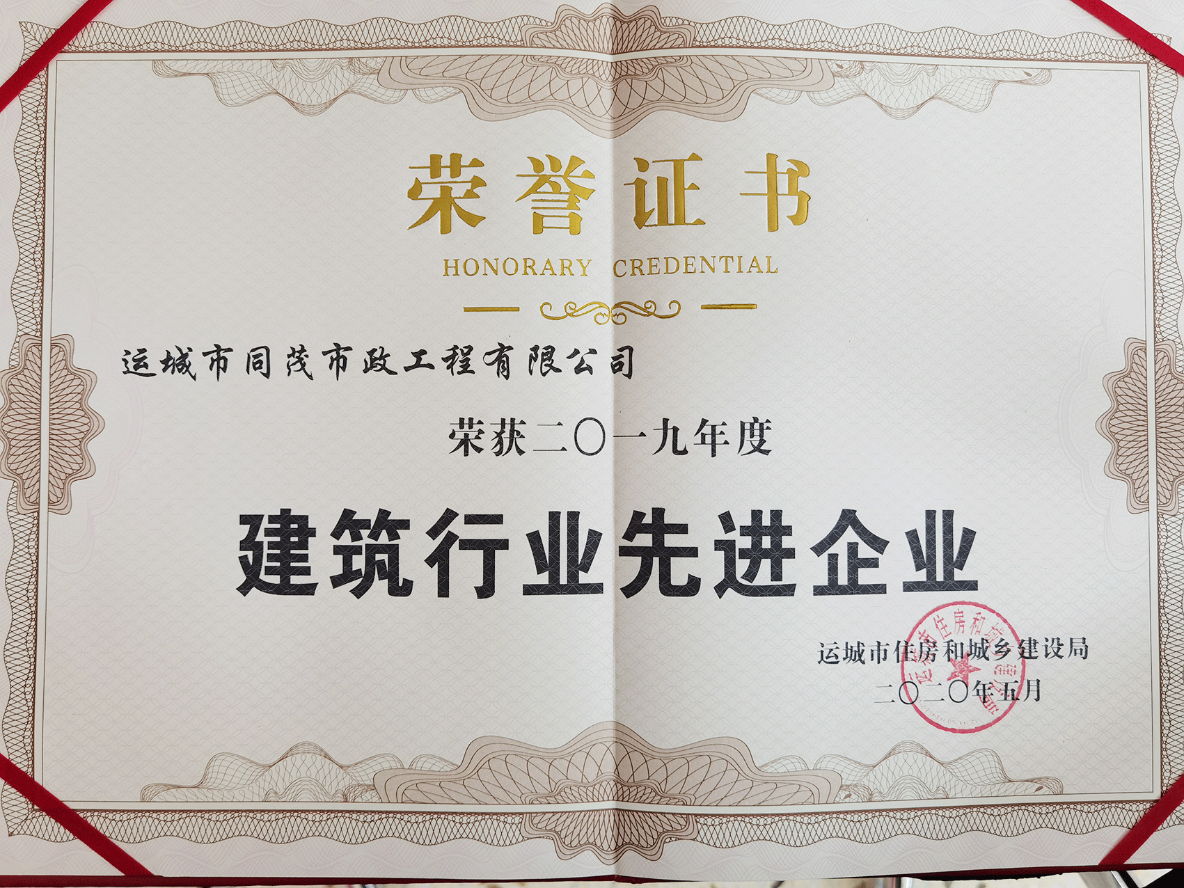 ▲運城市同茂市政工程有限公司榮獲“2019年度建筑行業先進企業”