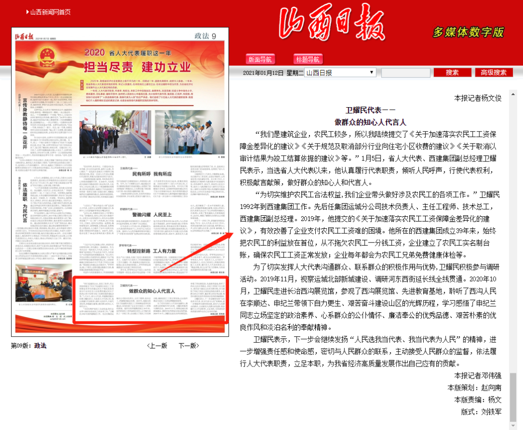“為切實維護農(nóng)民工合法權(quán)益,我們企業(yè)帶頭做好涉及農(nóng)民工的各項工作。”衛(wèi)耀民1992年到西建集團工作。先后任集團運城分公司技術(shù)負責(zé)人、主任工程師、技術(shù)總工,西建集團副總經(jīng)理。2019年,他提交的《關(guān)于加速落實農(nóng)民工工資保障金差異化的建議》,有效改善了企業(yè)支付農(nóng)民工工資難的困境。他所在的西建集團成立39年來,始終把農(nóng)民工的利益放在首位,從不拖欠農(nóng)民工一分錢工資,企業(yè)建立了農(nóng)民工實名制臺賬,確保農(nóng)民工工資正常發(fā)放;企業(yè)每年都會為農(nóng)民工兄弟免費健康體檢等。