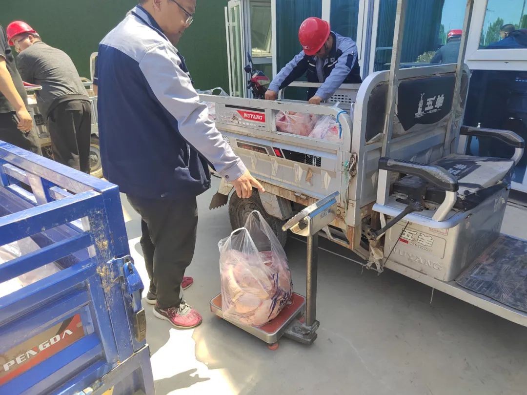 各個(gè)項(xiàng)目部的負(fù)責(zé)人來到領(lǐng)取處,按人頭算好斤數(shù),領(lǐng)取各組應(yīng)領(lǐng)的豬肉,大家都是滿載而歸。