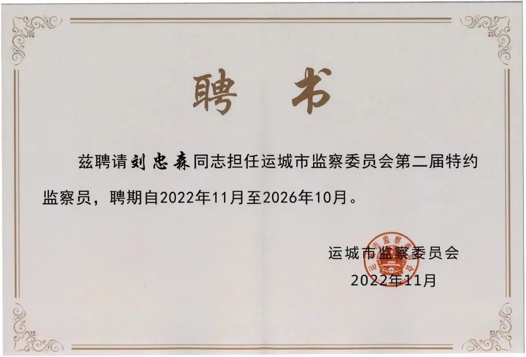 12月9日,市監(jiān)察委員會召開第二屆特約監(jiān)察員聘請會議,市委常委、市紀委書記、市監(jiān)委主任曹曉亮出席會議并講話。市政協(xié)委員、西建集團天茂房產(chǎn)總經(jīng)理劉忠森參加會議,并被聘為運城市監(jiān)察委員會第二屆特約監(jiān)察員。
