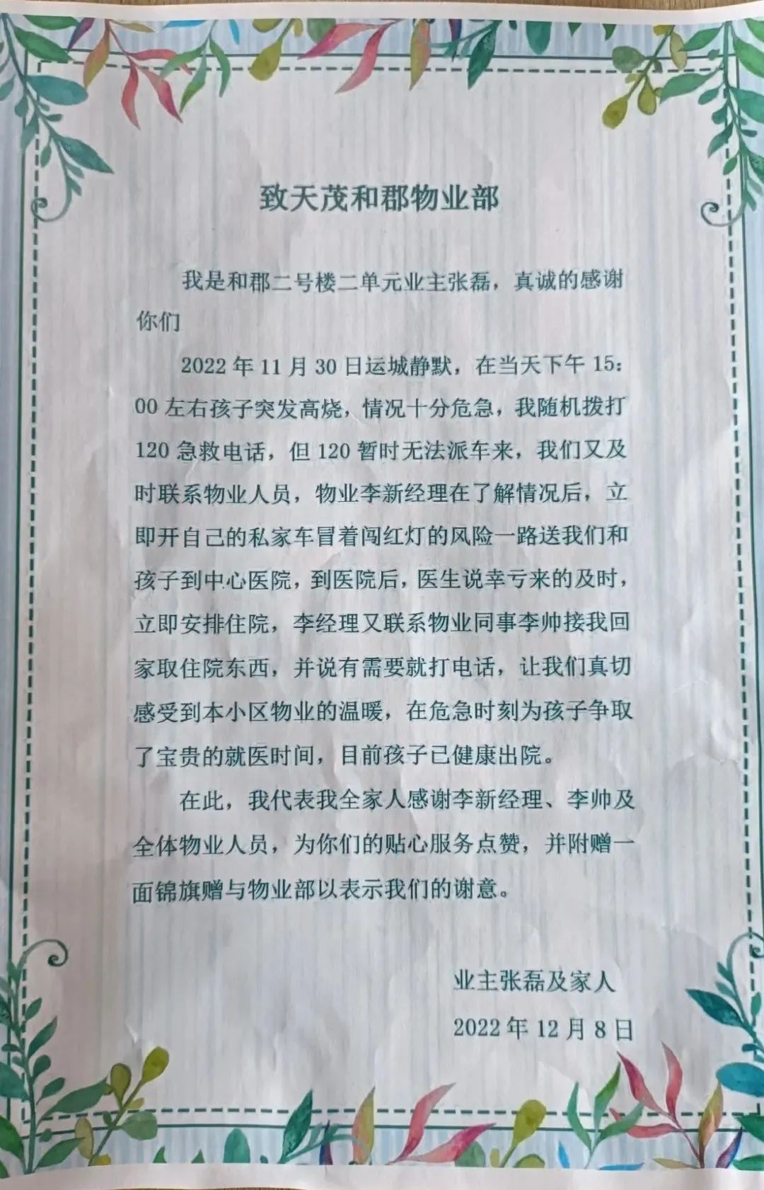 西建·天茂和郡業(yè)主張磊孩子突發(fā)高燒,在120暫時無法派車的情況下,物業(yè)經理迅速用自己的車,冒著闖紅燈的風險將孩子送往醫(yī)院,為孩子爭取了寶貴的就醫(yī)時間。業(yè)主在信里說道:真切感受到物業(yè)的溫暖,真誠感謝李新經理、李帥及全體物業(yè)人員。