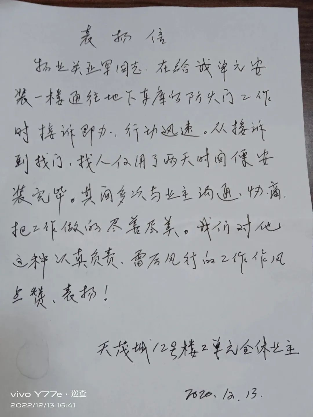天茂城物業(yè)關亞軍,對于小區(qū)業(yè)主的訴求盡心盡力,行動迅速,關亞軍雷厲風行、盡善盡美的工作作風,獲得了12號樓2單元全體業(yè)主的聯(lián)名點贊。